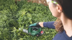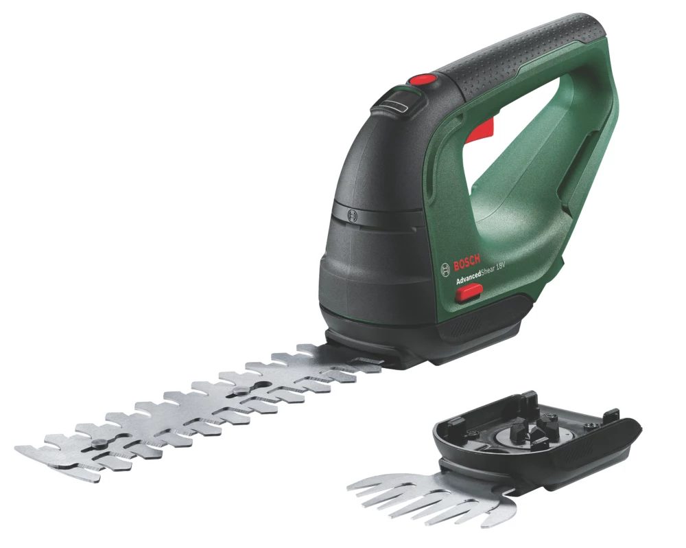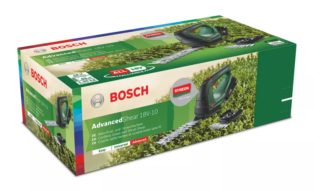 Versatile, cordless grass and shrub shears powered by 18V battery for strong cutting performance. Features blades for shaping and maintaining or edging and trimming. Anti-blocking system and Swiss-made, dual-action blades ensure impressive precision and continuous cutting without jamming on thick branches. Designed for single-handed use. Provides up to 85 minutes of battery runtime for convenient working. Part of the Bosch Green Power for All alliance system, where the 18V battery can operate a large variety of tools from different brands.