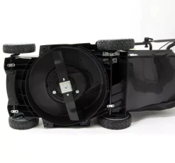 Five cutting heights with single-lever height adjustment. Versatile 2-in-1 function for mulching and rear collection. Easy to carry using integrated top handle, small size for easy storage. Cutting width 41cm, suitable for areas up to 800m² on one charge.