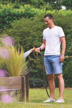 Multi-spray gun with 5 spray patterns. Features smooth flow control for a quick change of water flow. Choose the exact amount of water needed by adjusting between a high power jet for cleaning or gentle watering for flowers. Front trigger, ergonomic on/off lock button and flow control have all been located so they can be easily operated with just one hand giving instant access to all the features needed. Comes with a quick connect male connector which enables a fast changing between attachments.