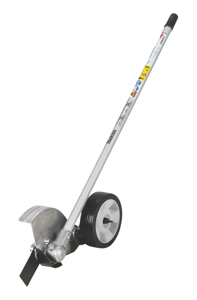 Edging attachment for Makita DUX60 cordless split shaft machine. Features straight solid drive shaft with heavy duty gear housing and skid plate. Extremely robust edging attachment for trade and DIY applications. Enables easy wheel replacement.