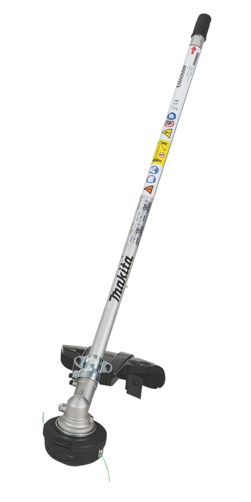 Line trimmer attachment for Makita DUX60 cordless split shaft machine. Steel drive shaft helps with reduced vibration and long product life. Features bump and feed line trimmer head and tool-less attachment installation.