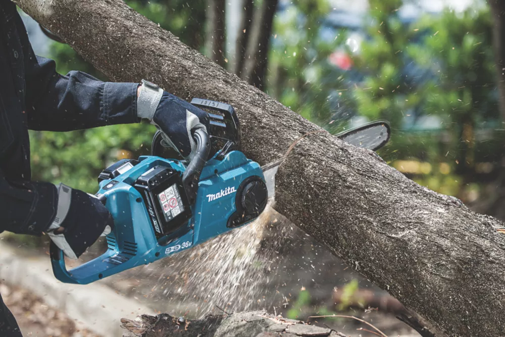 Powered by 2 x 18V Makita LXT batteries. Speed and performance matches that of a Makita 32cc petrol chainsaw. Features twin LED battery fuel gauges, an oil viewing window and an adjustable oil pump. Large metal spike bumper grips workpiece firmly to provide more control. XPT system reduces water and dust ingress when used in harsh weather conditions.