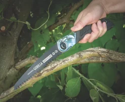 Ergonomic pistol-grip design with a rubber palm grip over a solid steel body. Quick-release blade for easy change and impulse-hardened, triple-ground teeth which are spaced for aggressive cutting of wet or dry wood. Thin, PTFE-coated blade cuts on the pull stroke, making it less likely to jam when cutting through thick branches.