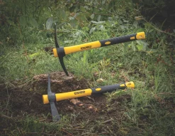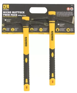 Contains micro pick for hard ground and removing mortar, and cutter mattock for soft ground and cutting roots. Convenient toolbag size for use where a full size pick or mattock is not practical. Drop-forged, heat-treated and powder-coated head for maximum strength and durability, and fibreglass handle with comfort-grip. Ideal for gardening, root cutting, landscaping and patio work.