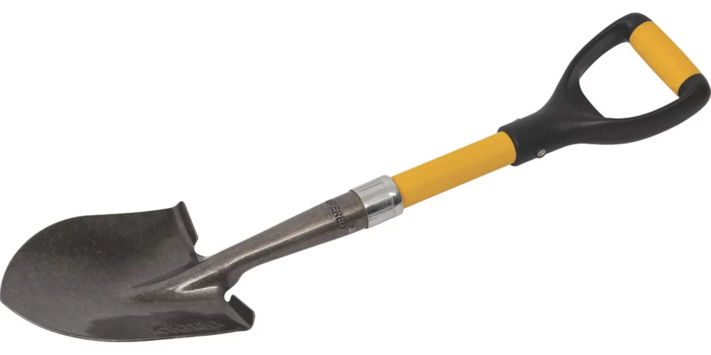 Rounded point, ideal for use in confined spaces. Small and easy to transport. Comfortable, D-shaped handle. Pressed-steel blade and fibreglass core handle.