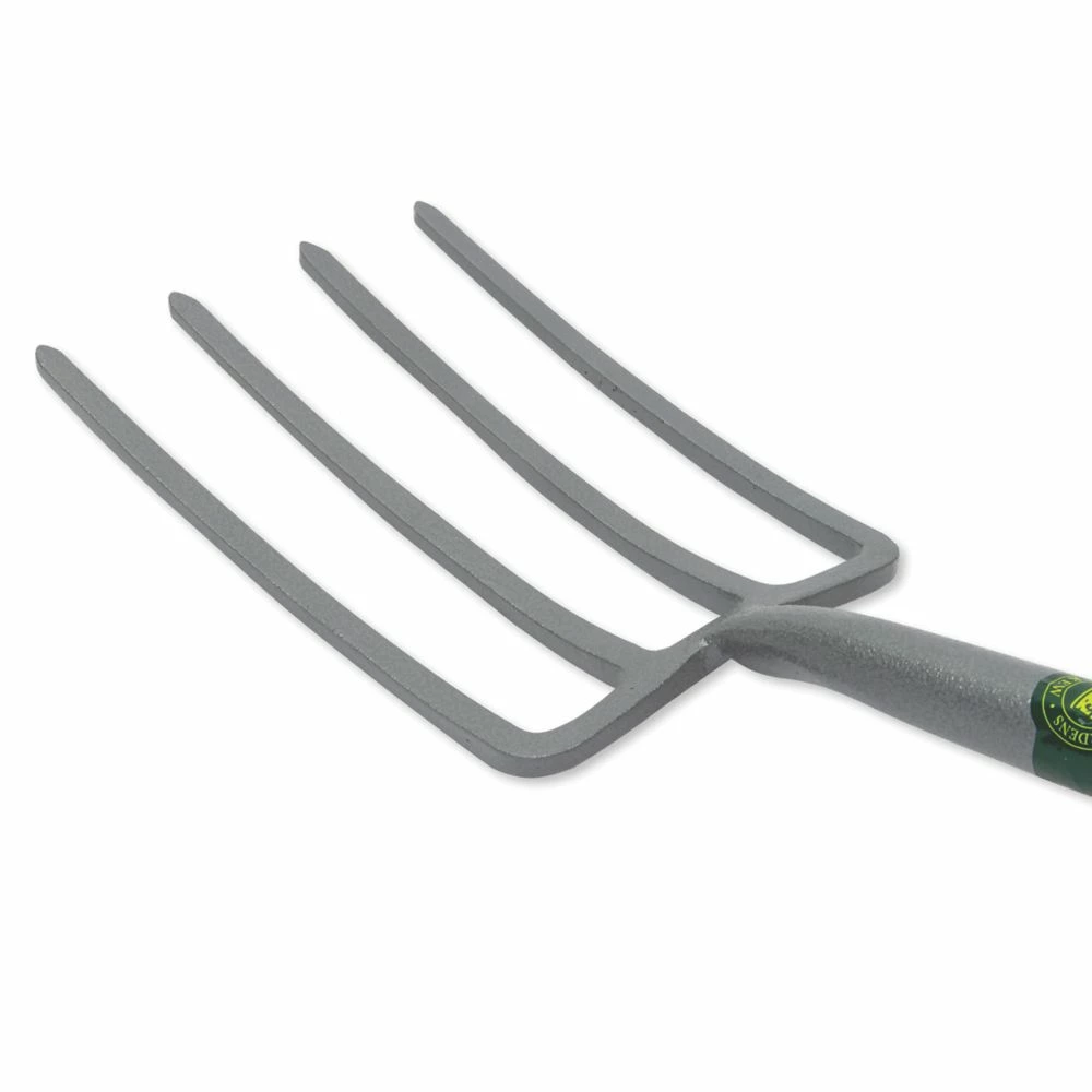 Exceptionally strong and built to last carbon digging fork. Solid-forged from a single piece of steel, making it ideal for digging over and breaking up soil. Hammer finished powder coating improves resistance to rust, humidity and soil alkalis. Ashwood weatherproof handle. Longer socket and handle reduces the need for bending and helps against back strain. Double width treads for more comfortable digging.