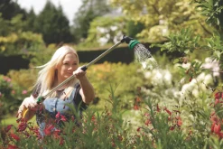 Features mist, shower, cone, soaker, jet, centre, flat, angle and fan flow / spray functions. Lightweight but strong aluminium shaft. Ergonomic soft-grip handle. Sliding thumb catch for easy flow control. Male brass connector included.