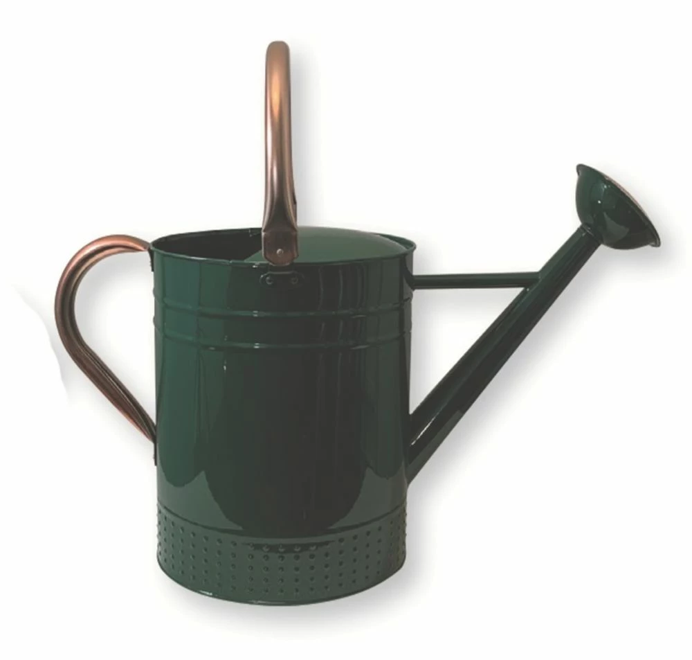 Elegant yet durable, in a traditional racing green enamel finish, with burnished copper-coloured handles and fully detachable watering rose. All-metal construction with fully sealed seams and rivet holes. Hinged handle for optimum balance as the can empties. Handle folds down for space saving storage.