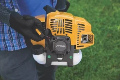 25.4cc 0.70kW 2-stroke petrol engine with well-balanced, curved shaft for greater leverage, which is jointed for easy transportation and storage. Ideal for perfecting borders and trimming grass around obstacles in the lawn. Features single loop soft-grip handle and 38cm cutting width, with Tap and Go dual-line head, which quickly releases the line when tapped on the ground. Suitable clothing and visor advised, for protection from debris.
