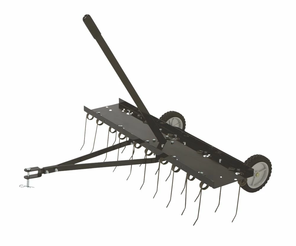 Designed to be used on large lawns to quickly and easily remove any thatch or moss that has gathered over time, allowing the lawn to thrive. Features pin-style hitch, 24 spring steel tines and heavy duty tray for adding weight.