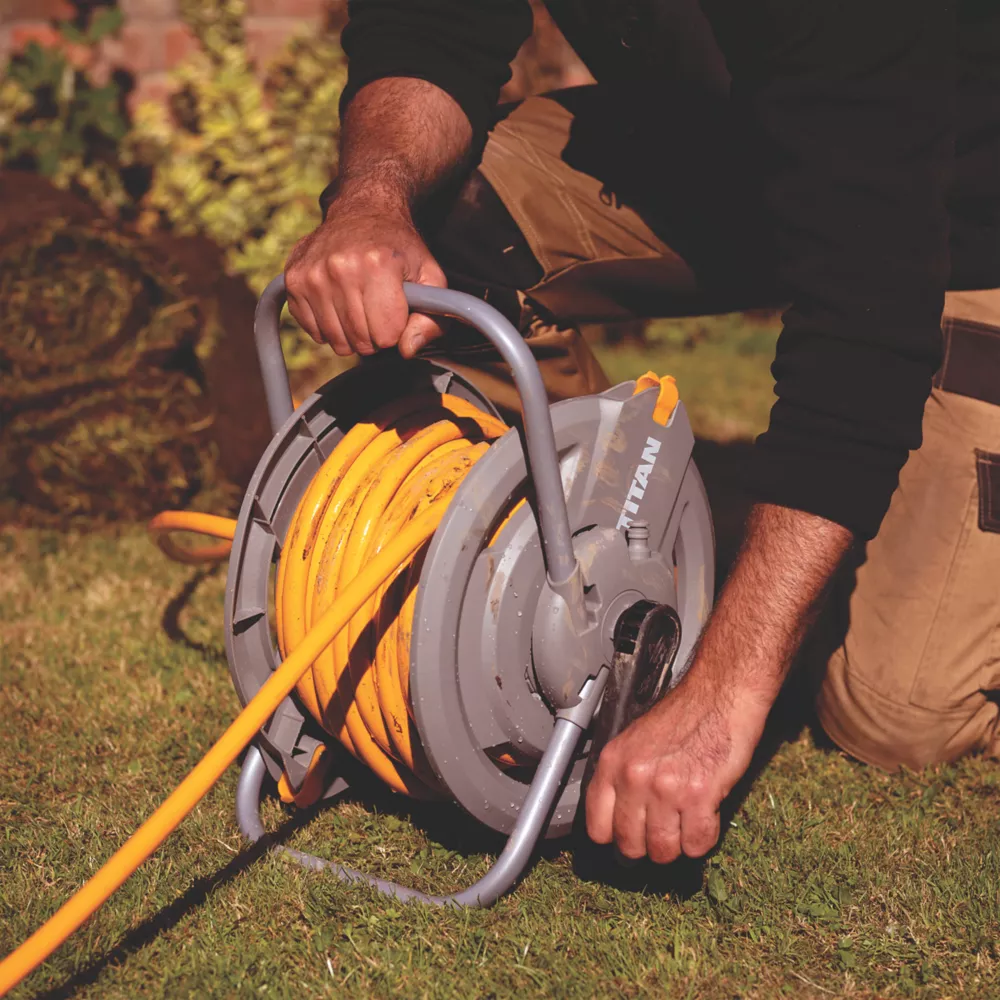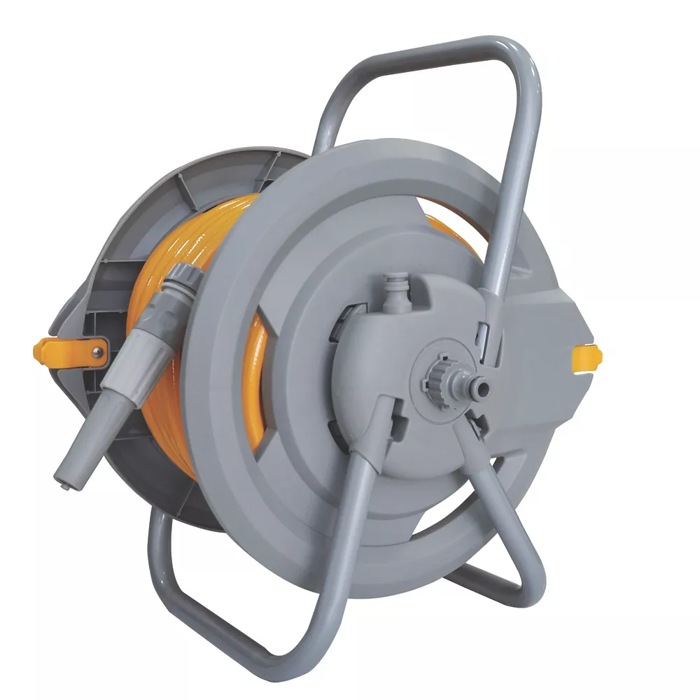 Free-standing or wall-mounted (fittings included). Easy-to-assemble hose reel has capacity to store 45m of hose.